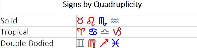 1. Character Traits: That is exactly what it sounds like. The figure tells you a person has a certain character trait. Character trait aspects can sometimes manifest as one or more events in a person’s life. The type of sign (fixed, bicorporal or tropical) will give you hints as to how many times in their life.